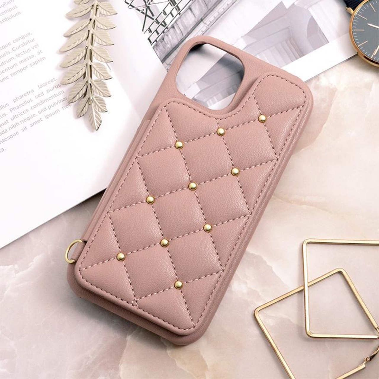 ふっくらして触り心地の良いキルティングレザー生地に、ゴールドのスタッズがアクセントとなって、高級感のある仕上がりになっています。