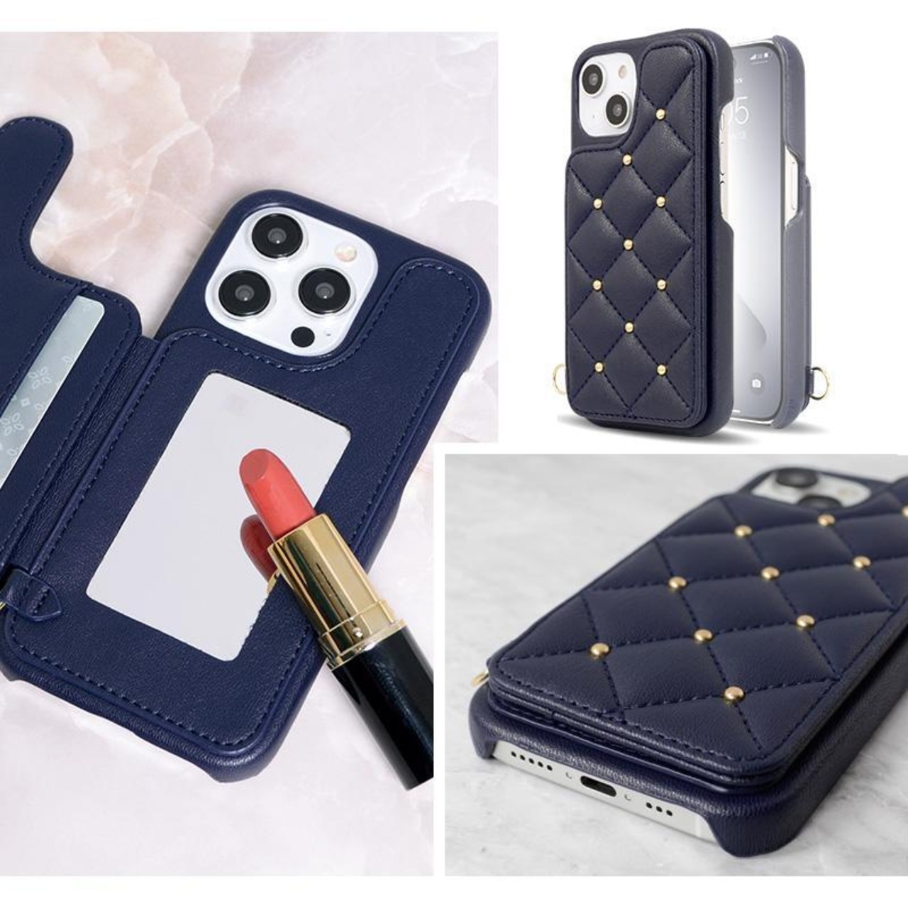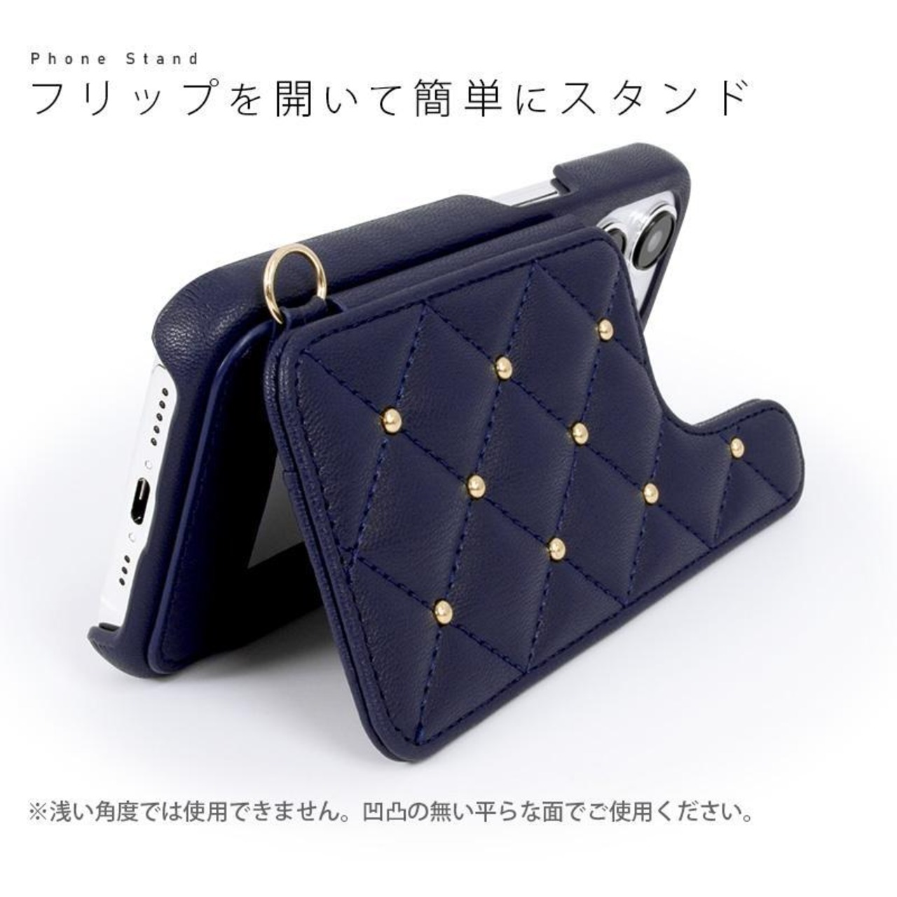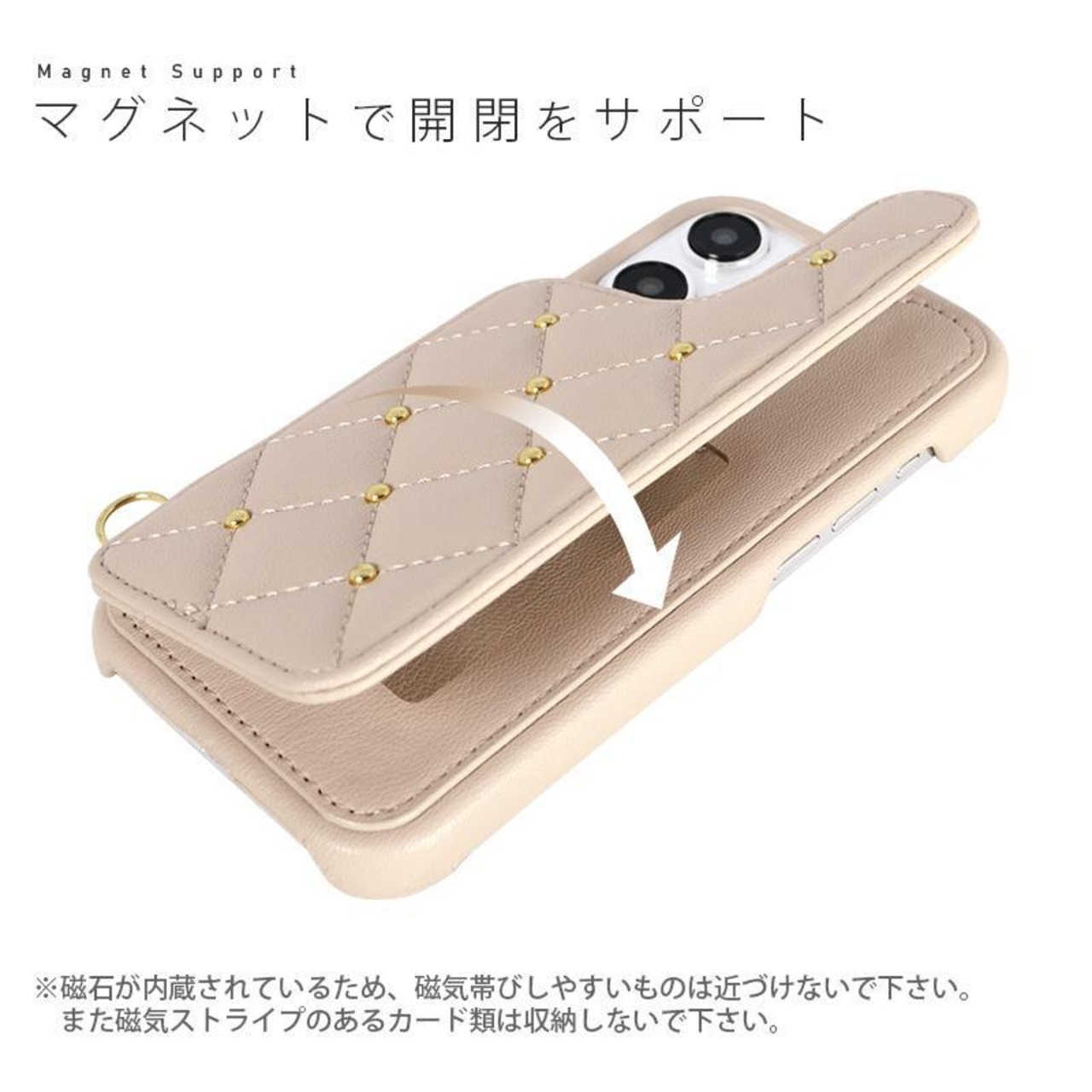 ※iPhoneの機能であるワイヤレス充電は、キルティング部分を開いてご使用下さい。充電器側の性能により使用出来ない場合は、本製品を外してご使用ください。